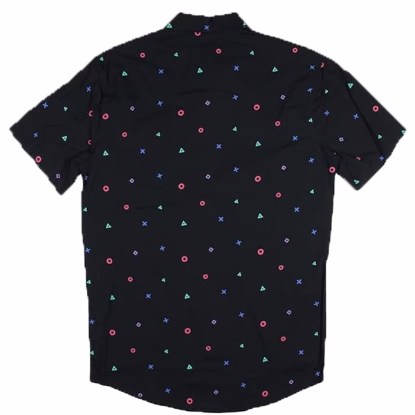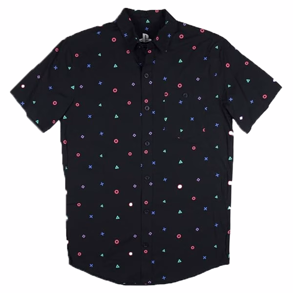 Esta camisa negra tejida con botones cuenta con un diseño estampado de iconos de control de juegos.
