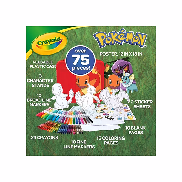 CHARMANDER CONJUNTO DE COLOR Y ESTUCHE DE ARTE: Este Charmander Art Case cuenta con más de 75 piezas, incluyendo 24 Crayones, 10 Marcadores de Línea Fina, 10 Marcadores de Línea Ancha, 16 Páginas de Arte de Línea, 10 Páginas en Blanco, 3 Estándares de Personaje, etc, 2 Hojas de Pegatina, y un Estuche de Almacenamiento Pikachu con Pegatina de Personaje.