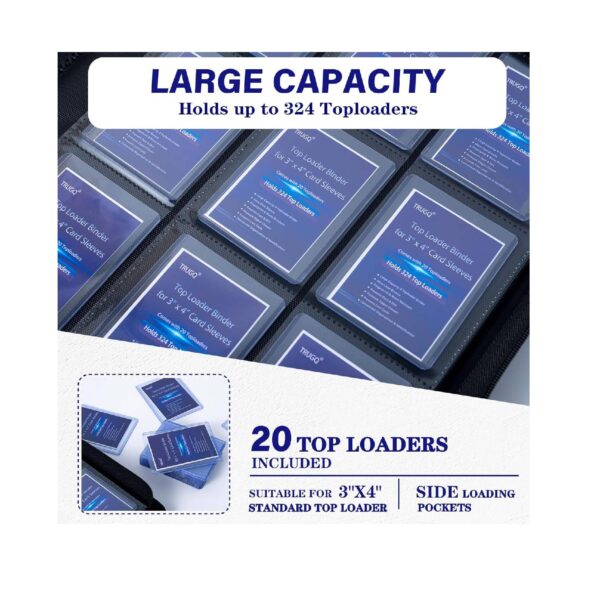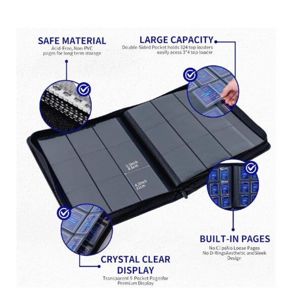 - Gran capacidad de 324 tarjetas Toploader, diseño de 36 páginas, 9 bolsillos por página, y viene con 20 soportes para tarjetas estándar adicionales para satisfacer tus necesidades de almacenamiento y expansión.