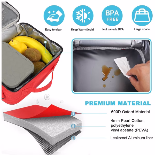 - La bolsa puede mantener la comida fresca, caliente y fresca. Se utiliza como bolsas de almuerzo escolar, bolsas de refrigeración, bolsas de picnic, bolsas diversas, lonchera para guardería.