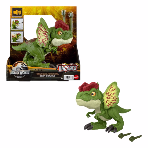 - Lanzamiento Feroz. Este juguete de Jurassic World tiene una acción dramática de disparo de proyectiles que ruge y dispara para revivir momentos memorables del Dilophosaurus en pantalla. Viene con 2 proyectiles en forma de dardo.