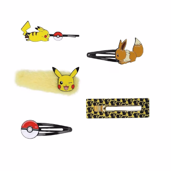 - Disfruta de un delicioso surtido de cinco pinzas de pelo diferentes de personajes de Pokémon, lo que te permite cambiar tu estilo y combinarlos con diferentes.