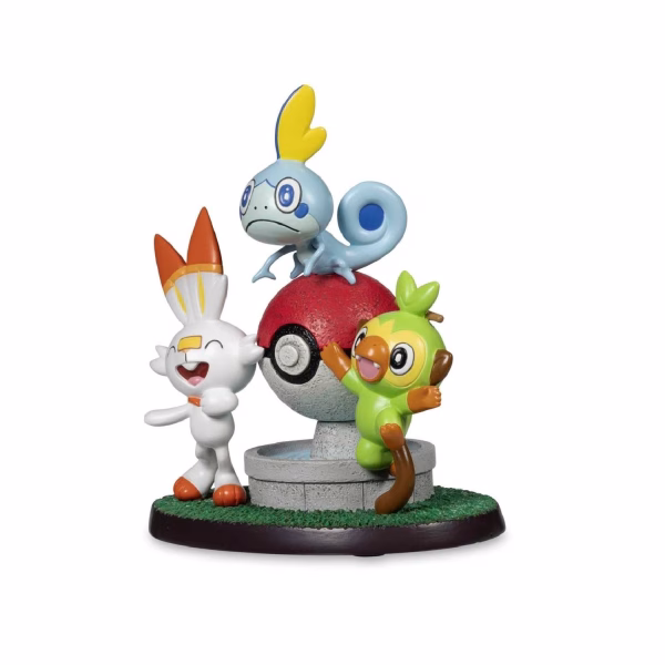 Únete a este trío de Pokémon primerizos mientras se preparan para una nueva aventura y nuevos descubrimientos en la región de Galar. ¡Grookey, Scorbunny y Sobble celebran un nuevo comienzo alrededor de una fuente de Poké Ball en esta alegre figura!