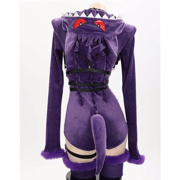 Inspirado en el popular Pokémon tipo fantasma. Traje morado oscuro con capucha, orejas puntiagudas y detalles faciales del personaje. Disponible en estilo cómodo tipo onesie o versión ajustada para eventos cosplay.