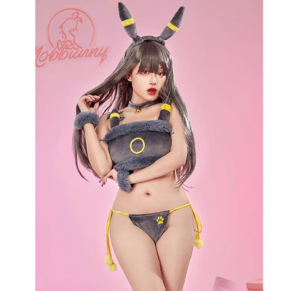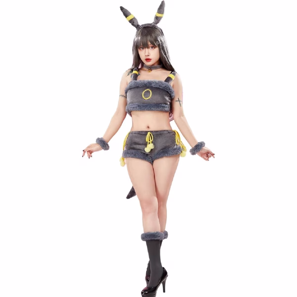 traje ceñido en negro nocturno con anillos dorados brillantes, orejas puntiagudas y cola temática, inspirado en el elegante Pokémon tipo siniestro. Incluye top, falda o pantalón, diadema con orejas y detalles dorados que evocan su diseño original. Ideal para convenciones, sesiones de fotos o eventos temáticos donde destacarás con estilo misterioso y sofisticado.