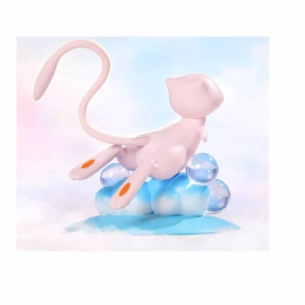 La figura se caracteriza por su pose de flotación o vuelo, que es fiel a la naturaleza de Mew, el Pokémon que se dice que contiene el ADN de todos los demás. menudo, el diseño presenta a Mew con su característica cola larga y ojos grandes y curiosos. La expresión suele ser inocente y adorable.