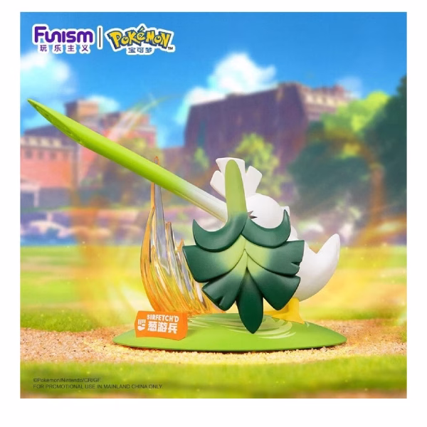 El diseño de Funism se centra en la esencia de Sirfetch’d como un caballero, mostrándolo típicamente en una pose de ataque o defensa. Su pose más común lo representa blandiendo su lanza de puerro (leek) y su escudo de hoja (shield), a menudo con un movimiento ascendente o un golpe poderoso.