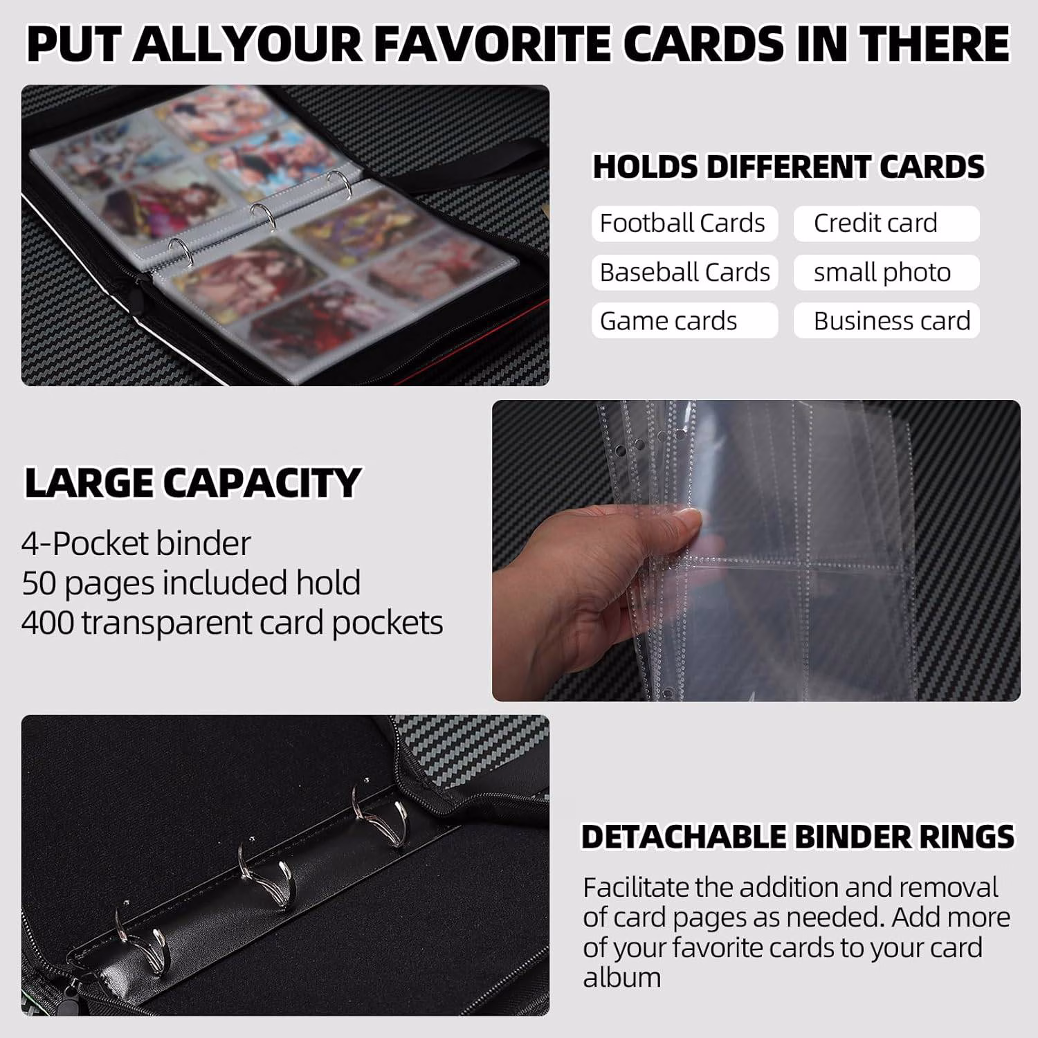 - Gran capacidad: 4 bolsillos para tarjetas comerciales, se adapta a 400 tarjetas con 50 fundas extraíbles; el diseño de 3 anillos es conveniente para añadir o quitar fundas y satisface todas tus necesidades de colección.