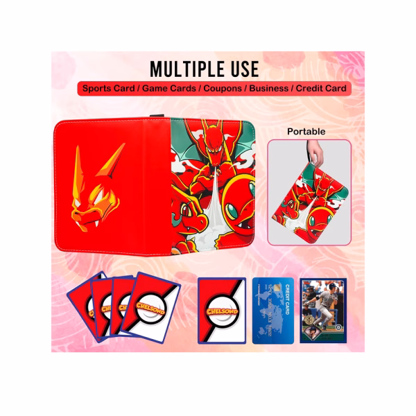Este portafolio premium te ofrece materiales resistentes al agua y polvo, un diseño único con temática de Charmander, Charmeleon y Charizard, y una gran capacidad para mantener tus cartas seguras y ordenadas.
