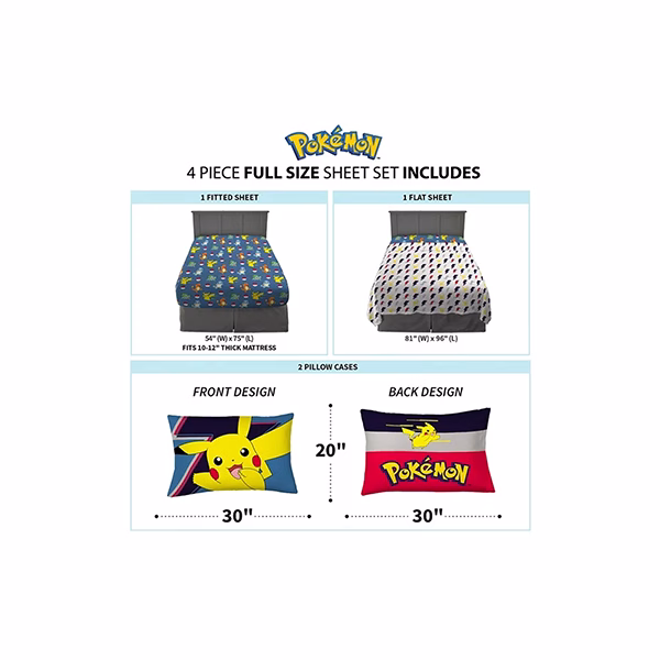 - ★ POKEMON DESIGN: A tu pequeño jugador le encantará vestir su cama con este divertido y colorido juego de sábanas de Pokémon con sus personajes favoritos de videojuegos, Pikachu, Charmander, Squirtle y Bulbasaur.