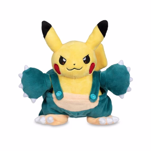 Como se ve en los videojuegos de Pokémon, los Poké Maníacos son Entrenadores que adoran disfrazarse de Pokémon y otras criaturas imponentes. Aunque este peluche de Pikachu está disfrazado de Snorlax, ¡no tiene sueño para nada! Con su mirada desafiante, ¡parece más que listo para entrar en batalla!