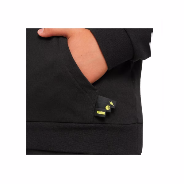 Sudadera con capucha con el logotipo negro de Pokémon para niños y niñas, diseñada por Puma. Fabricada con suave algodón, presenta un estampado del logotipo de Pokémon en la parte delantera, así como un bolsillo frontal. Con cuello de capucha y mangas largas con puños y dobladillo acanalados.