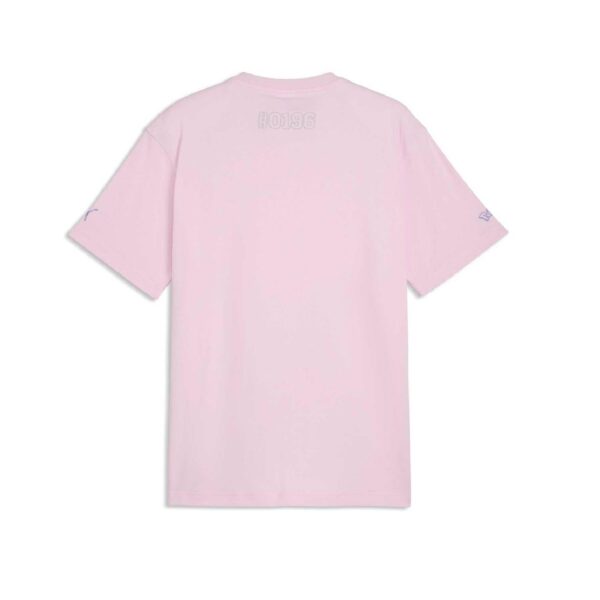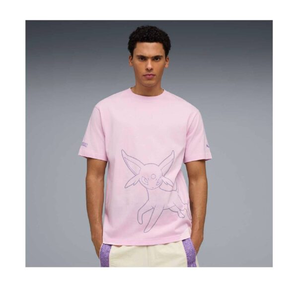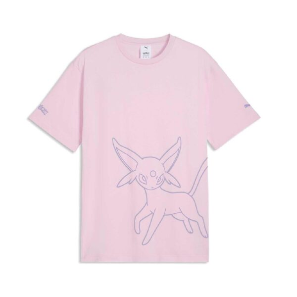 ¿Qué mejor manera de empezar un día lleno de diversión que con el mismísimo Pokémon Sol? Esta camiseta rosa luce a Espeon con los logotipos de Pokémon y PUMA en las mangas.