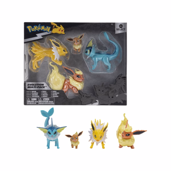 ¡Embárcate en una aventura evolutiva con el adorable Eevee y sus tres asombrosas evoluciones en este set especial de Pokémon Select!