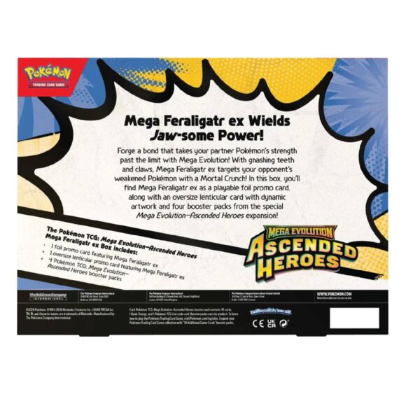 ¡Forja un vínculo que lleva la fuerza de tu compañero Pokémon al límite con la Megaevolución! Con garras y dientes rechinantes, Mega Feraligatr ex ataca al Pokémon debilitado de tu rival con un Crujido Mortal. En esta caja, encontrarás a Mega Feraligatr ex como carta promocional foil jugable, junto con una carta lenticular de gran tamaño con ilustraciones dinámicas y cuatro sobres de mejora de la expansión especial Megaevolución-Héroes Ascendidos.