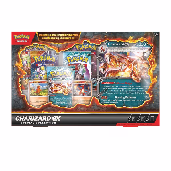 Hazlo evolucionar de Charmander y Charmeleon, utiliza la fuerza de su Habilidad y ataca para volver rugiendo al combate. Este ardiente set viene con 5 sobres de refuerzo de JCC Pokémon y 1 carta jumbo con efecto 3D del Pokémon Llama. Con solo mover esta carta impresa con tecnología lenticular, ¡podrás ver a Charizard ex lanzándose al ataque.