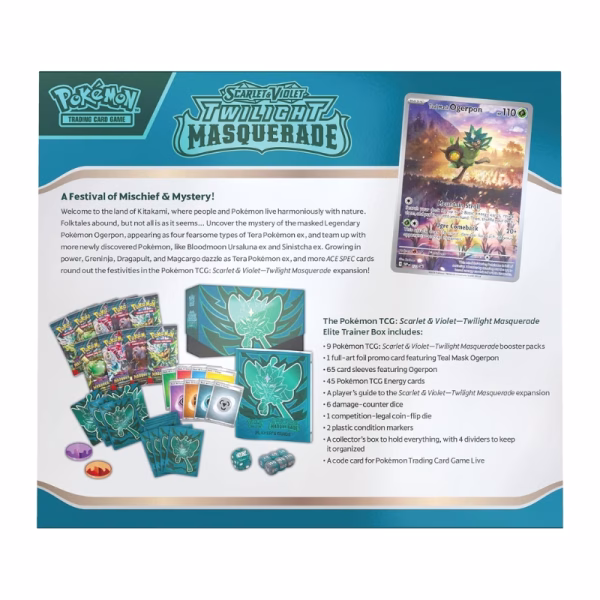 Bienvenidos a la tierra de Kitakami, donde las personas y los Pokémon viven en armonía con la naturaleza. Abundan los cuentos populares, pero no todo es lo que parece… Descubre el misterio del Pokémon legendario enmascarado Ogerpon, que aparece como cuatro tipos temibles de Pokémon Tera ex, y forma equipo con más Pokémon recién descubiertos, como Bloodmoon Ursaluna ex y Sinistcha ex. Cada vez más poderosos, Greninja, Dragapult y Magcargo deslumbran como Pokémon Tera ex, y más cartas ACE SPEC completan las festividades en la expansión Pokémon TCG: Scarlet & Violet—Twilight Masquerade: