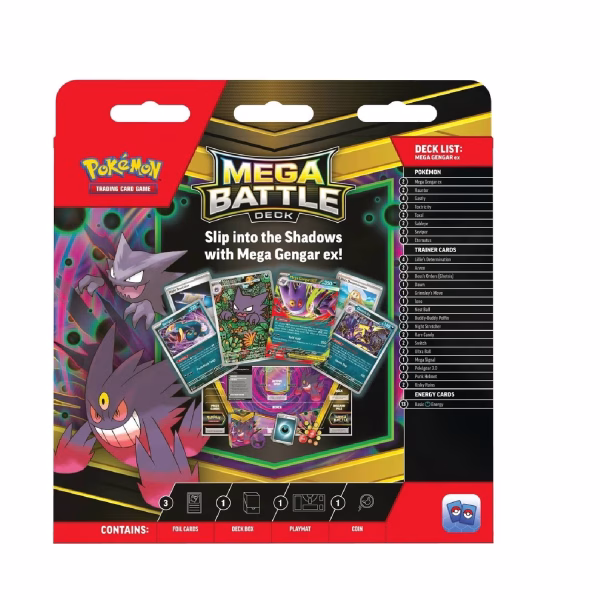 Dos nuevas barajas de Megabatalla de JCC Pokémon están listas para la acción! Forma equipo con Mega Gengar ex y lucha desde las sombras, . Cada baraja incluye un poderoso Pokémon ex y todo lo necesario para jugar de inmediato.