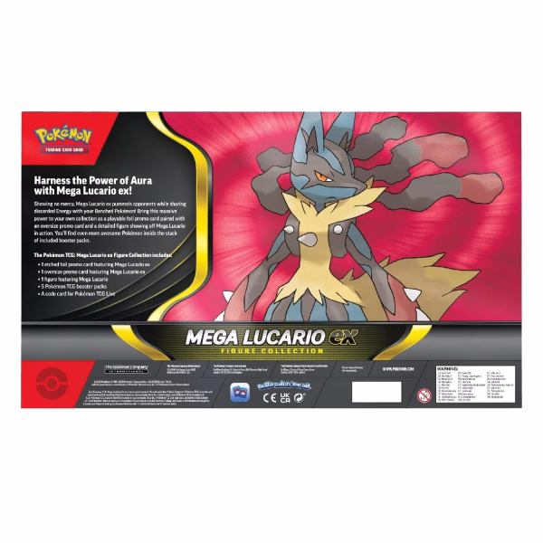 Mega Lucario ex está listo para someter a sus oponentes, a la vez que apoya a sus aliados compartiendo Energía descartada con Pokémon en Banca. Aprovecha el enorme poder del Pokémon Aura con una carta promocional holográfica jugable, una carta promocional de gran tamaño y una figura detallada de Mega Lucario en acción. ¡Hay un montón de poderosos aliados Pokémon listos para liberarse de los paquetes de mejora!