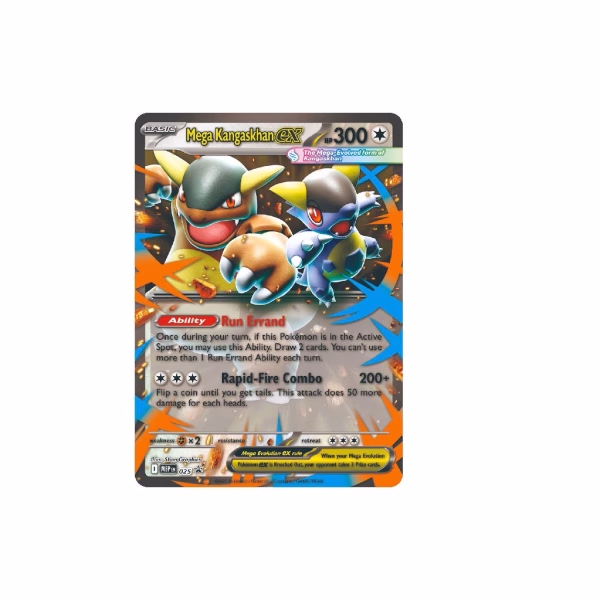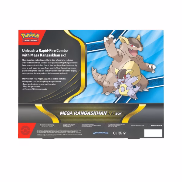 Tras la Megaevolución, la cría de Kangaskhan se convirtió en una fuerza imparable, ¡y ambos combinarán sus poderes como Mega-Kangaskhan ex para robar cartas extra con Encargo Urgente e intentar infligir aún más daño lanzando monedas con Combo Incesante! Une fuerzas con Mega-Kangaskhan ex que llega en forma de carta promo holográfica lista para jugar y en versión lenticular jumbo para presumir. ¡Además encontrarás otras increíbles cartas en los 4 sobres de refuerzo incluidos!