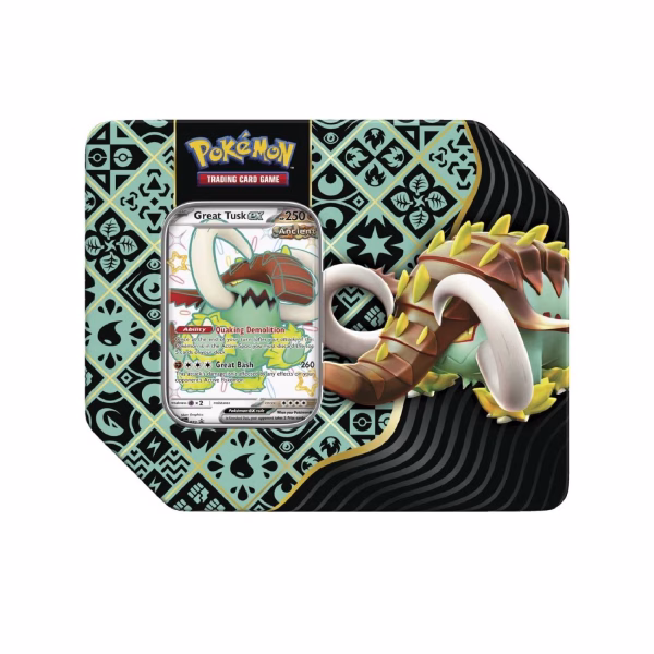 ¡Contempla el asombroso poder de los Pokémon shiny ex que trascienden los límites del tiempo y el tipo! Con esta lata, elige la fuerza estremecedora de Great Tusk ex como un Pokémon ancestral y descubre cartas aún más increíbles en los paquetes de refuerzo Scarlet & Violet—Paldean Fates .