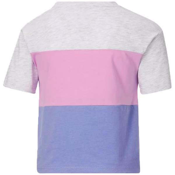 Esta camiseta de manga corta presenta un diseño de bloques de color con tres secciones horizontales: la parte superior es de color gris claro, la sección central es rosa y la parte inferior es azul claro. La camiseta tiene un cuello redondo y el logotipo de Puma en el lado superior izquierdo del pecho, en una combinación de colores rosa y azul. Está confeccionada con materiales suaves y cómodos, lo que la hace ideal para el uso diario. Perfecta para quienes buscan un estilo vibrante y moderno.