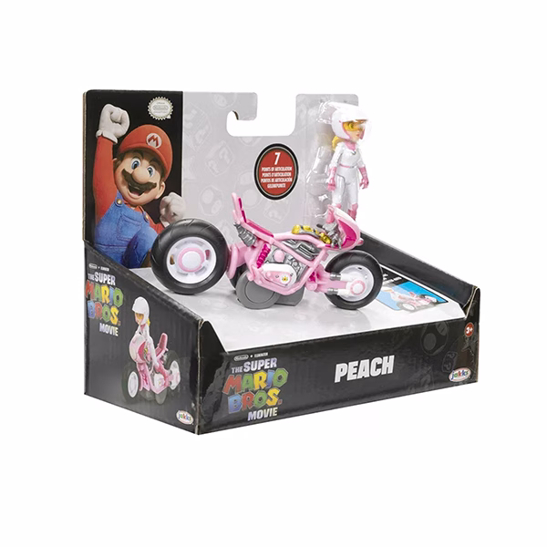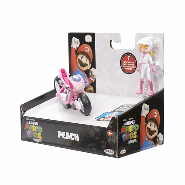De Nintendo e Illumination llega una nueva película animada basada en el mundo de Super Mario Bros. Los hermanos Mario se encuentran transportados a una tierra misteriosa llamada el Reino Champiñón. Únete a Mario en su misión para salvar a Luigi y al mundo de las garras del malvado Bowser y su ejército. Colecciona a tus personajes favoritos con la figura de 2.5 pulgadas de The Super Mario Bros. Movie con karts de fricción. Inspirada en la película, la figura de Peach tiene una articulación única que le permite sentarse en su vehículo. ¡Tira hacia atrás y mira cómo avanza! La primera ola incluye a Mario, Peach, Toad y Koopa Troopa. ¡Puedes coleccionarlos todos!